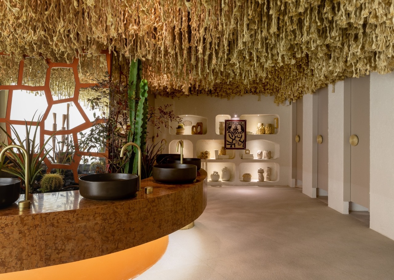 As cores e materiais selecionados para o espaço foram pensados para evocar as paisagens e as culturas das cidades de origem dos arquitetos. O mármore Rosso Verona, utilizado na bancada, remete aos tons terrosos do sertão baiano, enquanto o sisal é trabalhado de forma a destacar sua beleza e versatilidade. O ambiente também conta com um espelho fragmentado, desenvolvido para representar o solo do sertão nordestino, enquanto o paisagismo trouxe uma vegetação mais seca, como o cacto.