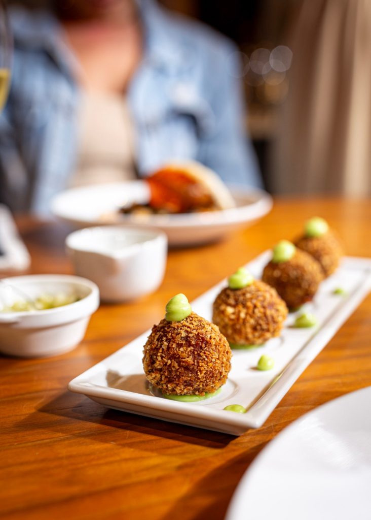 Entre as entradas, aparecem preparações que equilibram técnica e afeto, como o croquete de cupim, o clássico tartare de boeuf, o brie em massa folhada servido com mel baiano Meldoyá e a coxinha de siri acompanhada de ketchup de tamarindo, que não nega o desejo de valorizar o local. Há também opções como burrata, saladas frescas e um bao de pulled pork com salada de repolho e cenoura.