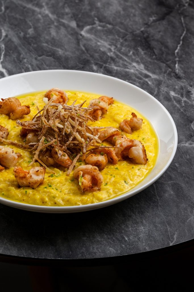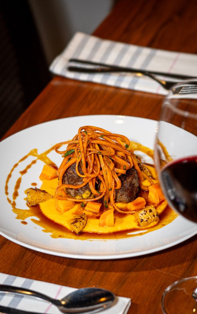 Nos pratos principais, a cozinha revela com mais clareza o diálogo entre técnica francesa e ingredientes locais. É o caso do risoto de camarão preparado com açafrão, em uma base safranée, finalizado com crocante de alho-poró, ou do robalo servido com nhoque grelhado, ratatouille e caldo de carne. O cardápio inclui ainda opções como polvo grelhado com batata ao murro e piperade de pimentões, picanha acompanhada de beignet de batata, técnica francesa de massa frita leve, e salmão grelhado com linguini ao molho de limão siciliano.