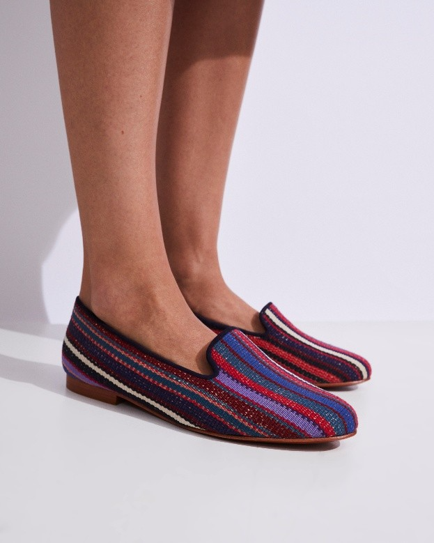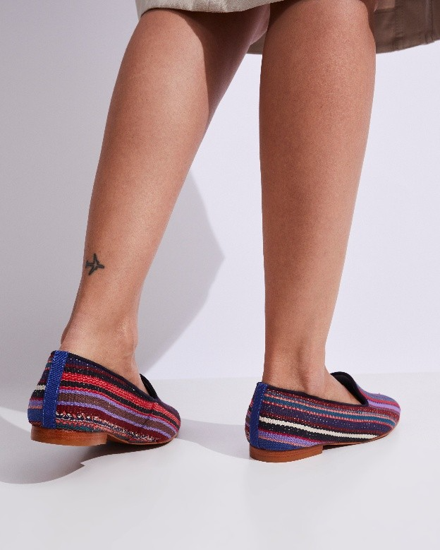 Os fragmentos fornecidos pela by Kamy – tecidos à mão – ganham uma nova função e forma, revestindo o calçado com um visual sofisticado, confortável e repleto de história.