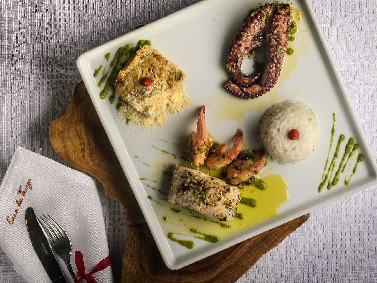 Para quem segue o costume de evitar carne vermelha, na sexta-feira ‘santa’, 18 de abril, o menu, assinado por Tereza Paim, oferece um repertório gastronômico que é a cara do período: Camarão no molho de mangaba e arroz de coco verde, Sinfonia do Mar, com Polvo, camarão, peixe, siri, arroz de coco e farofa, Risoto de Polvo e a apetitosa Moqueca Ana Bueno, generosamente servida com peiхe, camarao, polvo e banana da terra.