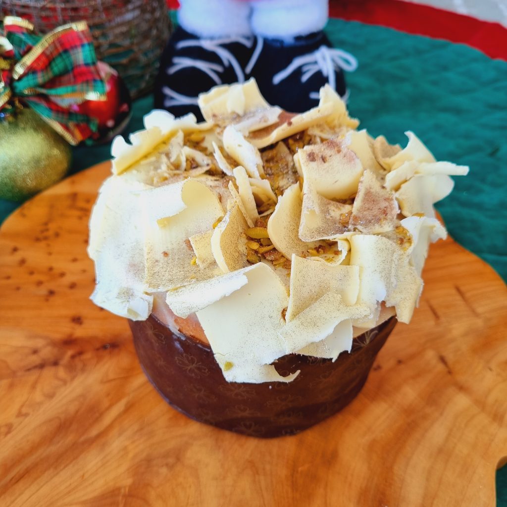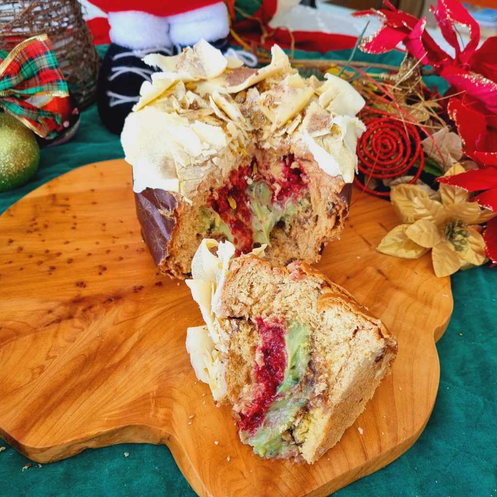 Os sabores do Natal 2021 de Jéssica Azevedo, que comanda a confeitaria que leva o seu nome, estão mais do que especiais. Com uma vasta oferta de panetones doces e salgados no cardápio, experimentamos o Chocotone trufado de pistache com framboesa (1kg) – massa de chocotone recheado com creme de pistache e geleia de framboesa [R$ 95,00].