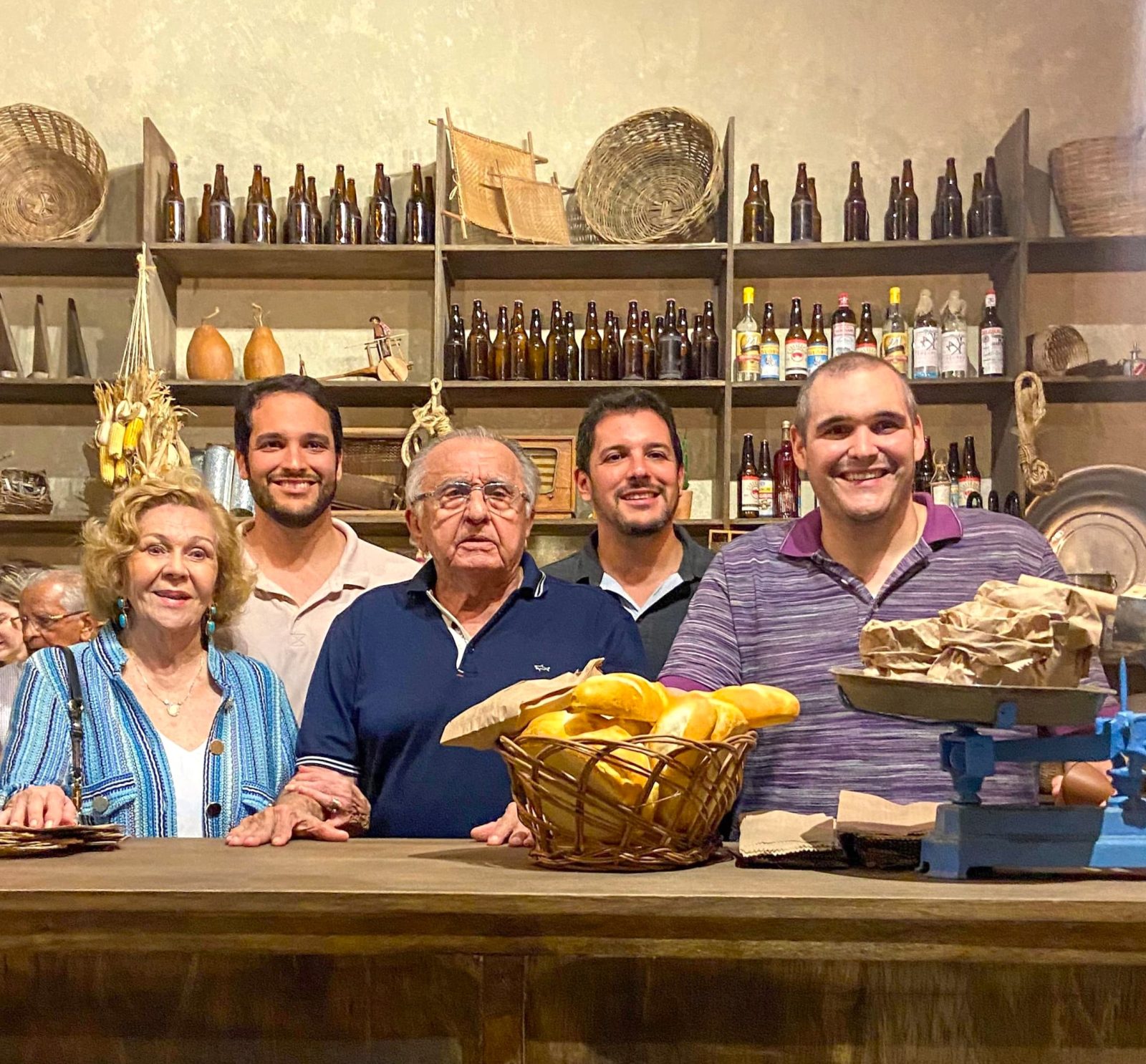 Na foto: João Carlos Paes Mendonça e Auxiliadora, sua esposa, ao lado dos netos Renato, João e Marcelo no balcão da antiga mercearia.