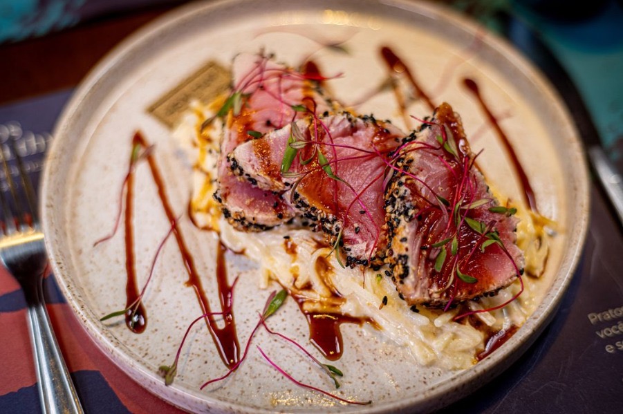 São três opções de entradas: brusqueta com tomate, mini salada e guacamole com chips de batata-doce. Entre os pratos principais, o menu traz o medalhão de filé com nhoque de batata-doce, o atum selado com espaguete de pupunha, o risoto de arroz negro com camarão e burrata e o salmão grelhado com purê de batata-doce e limão siciliano.