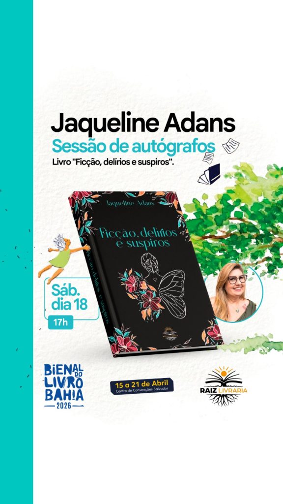 A jornalista e escritora Jaqueline Adans participa pela primeira vez da Bienal do Livro Bahia 2026, que acontece de 15 a 21 de abril, no Centro de Convenções de Salvador, apresentando ao público suas mais recentes obras e reforçando sua atuação na literatura contemporânea baiana. Pelo coletivo da Raiz Livraria serão relançados, “Ficção, Delírios e Suspiros”, seu primeiro livro, marcado para sábado, dia 18, das 17h às 18h, e “A História por trás da História”, antologia que participa com mais 35 autores baianos, no estande da editora na Asa A, Rua B48.