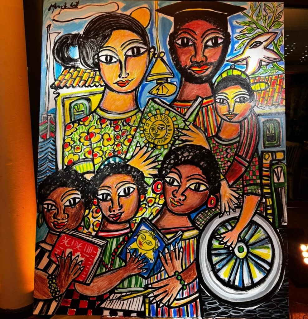 A obra apresentada por Menelaw Sete nesta noite de gala traduziu, com sensibilidade e intensa potência simbólica, valores universais como diversidade, inclusão e responsabilidade social, pilares que também orientam a atuação do Rotary. A tela, inicialmente concebida em preto e branco, ganhou cores ao vivo durante o evento, em um gesto artístico que simboliza o despertar para a pluralidade humana e para a beleza das diferenças.