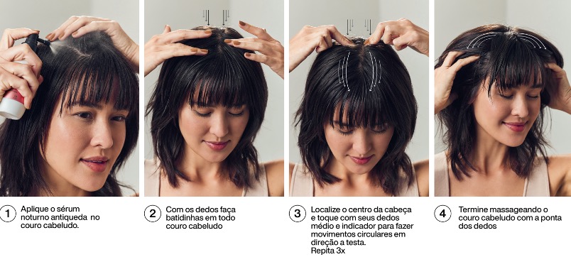 Modo de uso: aplique diariamente antes de dormir em toda a extensão do couro cabeludo posicionando o aplicador próximo ao couro cabeludo e acione a válvula. Massageie com as pontas dos dedos. Não enxaguar. Pela manhã, se sentir necessidade, lavar os cabelos. O produto pode ser aplicado no couro cabeludo com os cabelos limpos, secos ou úmidos. Se preferir, siga o passo a passo de automassagem Natura Lumina no momento de aplicação.