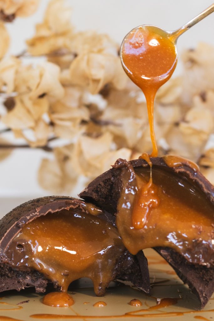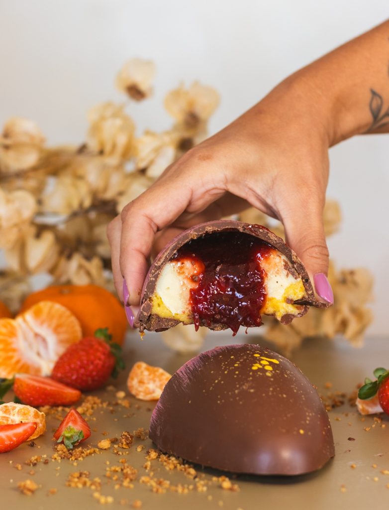Entre os destaques estão os ovos de corte, tendência que valoriza recheios cremosos e camadas de textura. O sabor Maracujá, três vezes eleito o Melhor de Salvador, traz meia casca de chocolate branco recheada com coulis da fruta, brigadeiro de cream cheese e crumble de castanha de caju.