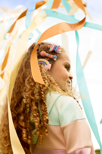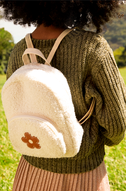 | Kit com três presilhas de cabelo coloridas (R$25,90) e mochila em sherpa com patch de flor (R$99,90) | Créditos: Divulgação Renner |
