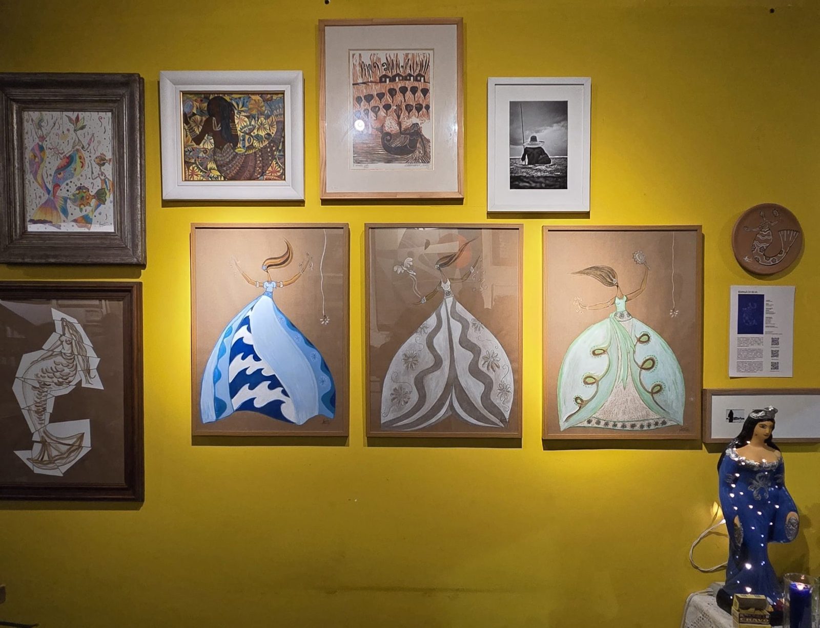 Nas obras de Alexandre Feliciano, o azul das águas abraça a intensidade das cores que traduzem a força, a ancestralidade e a delicadeza de Iemanjá. Ela é mítica, mas também familiar; majestosa e ao mesmo tempo tangível, uma mãe que acolhe, transforma e renova. Suas formas vibram como ondas, ecoando histórias e memórias que nunca cessam de chegar à praia.